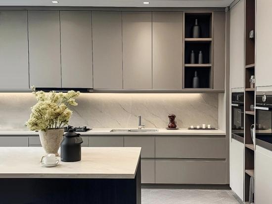 នេះ - សន្សំសំចៃ ទូផ្ទះបាយរាងអក្សរ L នៅក្នុងការបញ្ចប់ពណ៌ប្រផេះទំនើបត្រូវបានរចនាឡើងសម្រាប់ប្រសិទ្ធភាពនិងរចនាប័ទ្ម។ វាផ្តល់នូវកន្លែងផ្ទុកដ៏សម្បូរបែប រួមជាមួយនឹងធ្នើរបើកចំហរជាក់ស្តែង សម្រាប់ការចូលប្រើប្រាស់យ៉ាងរហ័សនូវអ្វីដែលចាំបាច់សម្រាប់ចម្អិនអាហារប្រចាំថ្ងៃ។ កោះរ៉ែថ្មខៀវដែលរួមបញ្ចូលមិនត្រឹមតែបន្ថែមចំណុចប្រទាក់រលោងប៉ុណ្ណោះទេ ប៉ុន្តែថែមទាំងបម្រើជាកន្លែងបរិភោគអាហារដ៏ងាយស្រួល និងរហ័សសម្រាប់គ្រួសារ ដែលធ្វើឱ្យវាក្លាយជាបេះដូងដ៏ល្អឥតខ្ចោះនៃផ្ទះដ៏មមាញឹក។